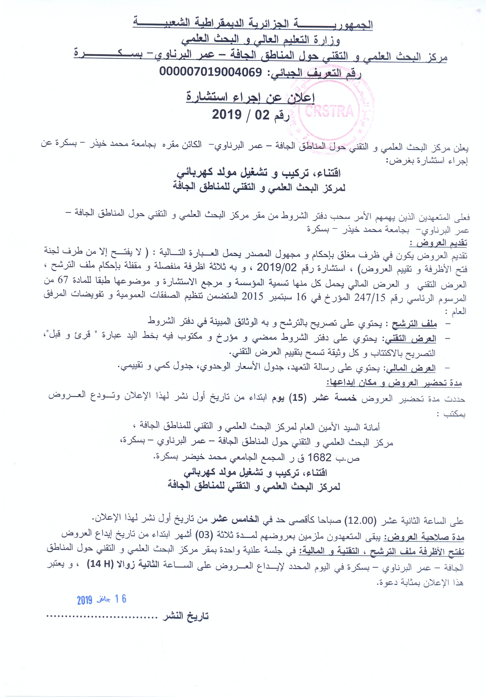 إعلان عن إجراء استشارة رقم 02 / 2017، استغلال النادي المركزي التابع للجنة الخدمات الاجتماعية لمركز البحث العلمي والتقني للمناطق الجافة – عمر البرناوي- بسكرة لسنة 2017