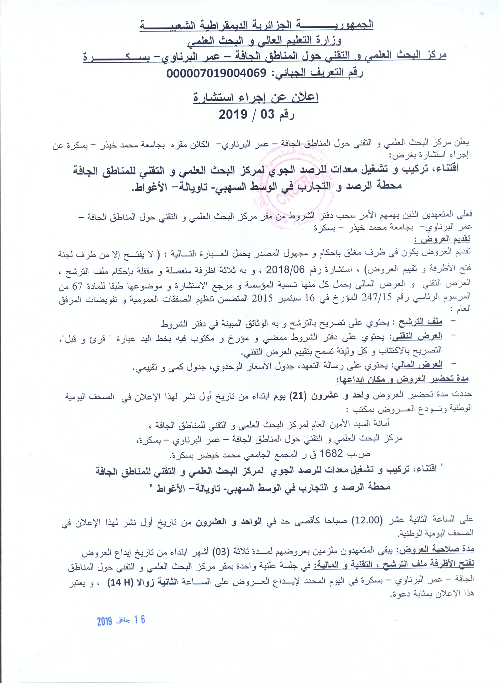 إعلان عن إجراء استشارة رقم 06 / 2018 اقتناء، تركيب و تشغيل معدات للرصد الجوي لمركز البحث العلمي والتقني للمناطق الجافة محطة الرصد والتجارب في الوسط السهبي -تاويالة- الأغواط